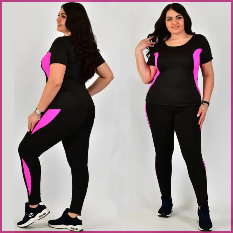 Жіночий спортивний костюм батал великих розмірів — це зручний комплект для занять спортом, що складається з футболки та лосин. Модель виконана в чорному кольорі з контрастними рожевими вставками, які додають стилю та візуально підкреслюють силует.